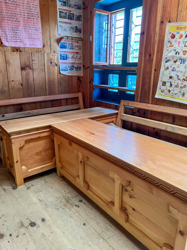 Aus dem heimischen Holz hat Handwerker Tilak Rai robuste und durchdachte Möbel geschaffen. Auf den ersten Blick erinnern die neuen Tische an schlichte Truhen. Doch das Design folgt einem klugen Hintergedanken. Die offene Rückseite ermöglicht den Kindern ein bequemes Sitzen. Die geschlossene Front schützt ihre Beine vor der Kälte. So verbinden sich Funktionalität und Schutz auf einfache und wirkungsvolle Weise.