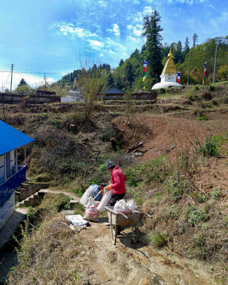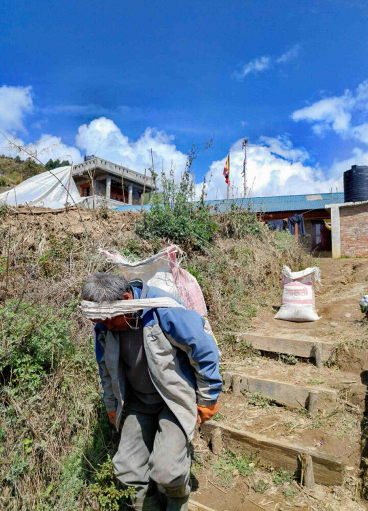 Auf Baustellen in ländlichen Regionen gibt es keine grossen Maschinen. Jeder Stein, jeder Sack Zement und jede Bodenplatte wird von Hand transportiert. Der gesamte Schutt der alten Anlage wurde mit Schaufeln in Säcke gefüllt und auf dem Rücken abgetragen. Auf demselben Weg gelangte das neue Baumaterial zur Schule. Schritt für Schritt entstand so die erneuerte WC-Anlage.