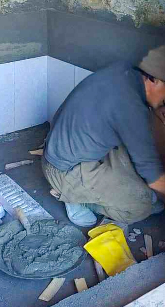 Die neuen Steh WC-Schüsseln wurden fest installiert. Anschliessend bereitete der Handwerker den Untergrund für die abschliessenden Pflasterarbeiten vor. Zum Schluss wurden Wand und Boden sorgfältig mit Platten versehen.