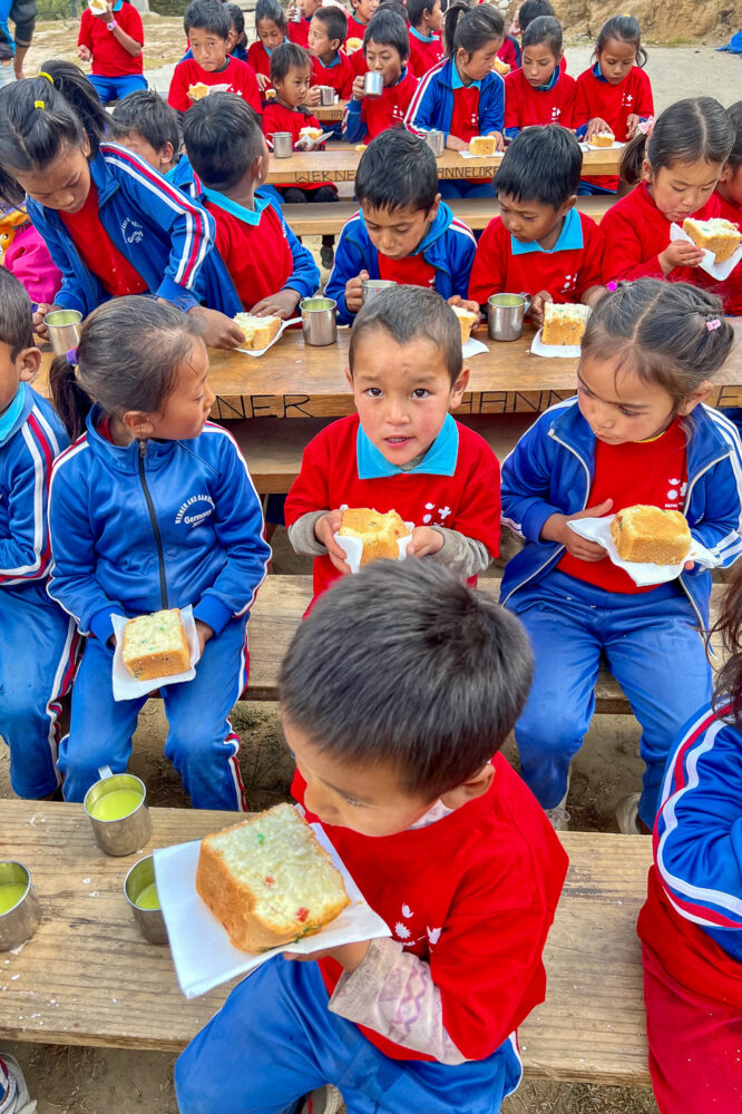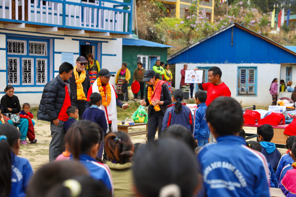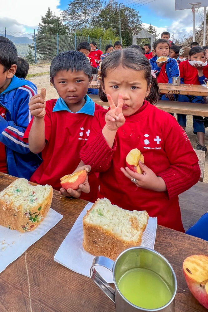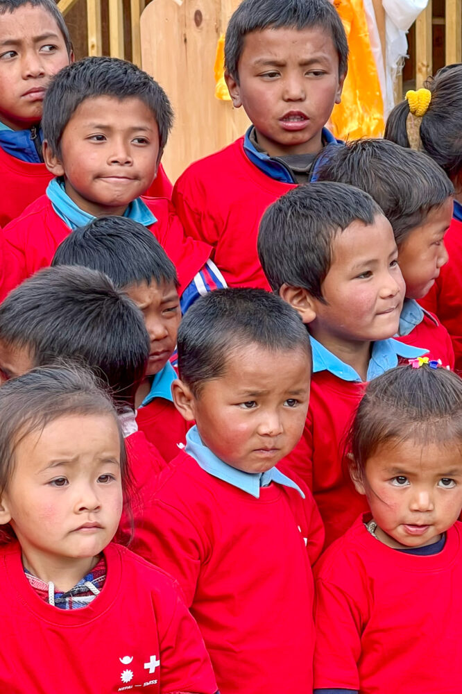 Die Outdoor-Schullektion wurde feierlich mit kulturellen Tänzen und Musik umrahmt. Das Projekt-Team wurde auf traditionelle Art und Weise geehrt und beschenkt. Die Gemeindepräsidentin, der Schul- und Gesundheitsminister vom Tapting haben ebenfalls teilgenommen und je eine kurze Ansprache gehalten. Jedes Kind bekam ein rotes Nepal Swiss T-Shirt geschenkt. Gemeinsam tranken wir Tee und assen Kuchen und Äpfel.